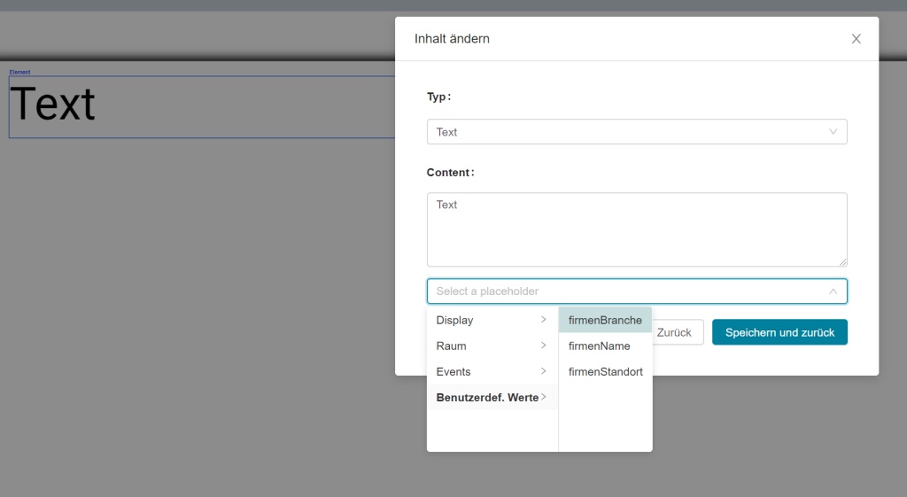 Da Display-Werte lokal auf den Geräten gespeichert sind, hat der Layout-Editor keinen direkten Zugriff aus diese. Sie können die Platzhalter aber dennoch manuell setzen, indem Sie wie im obigen Beispiel einfach