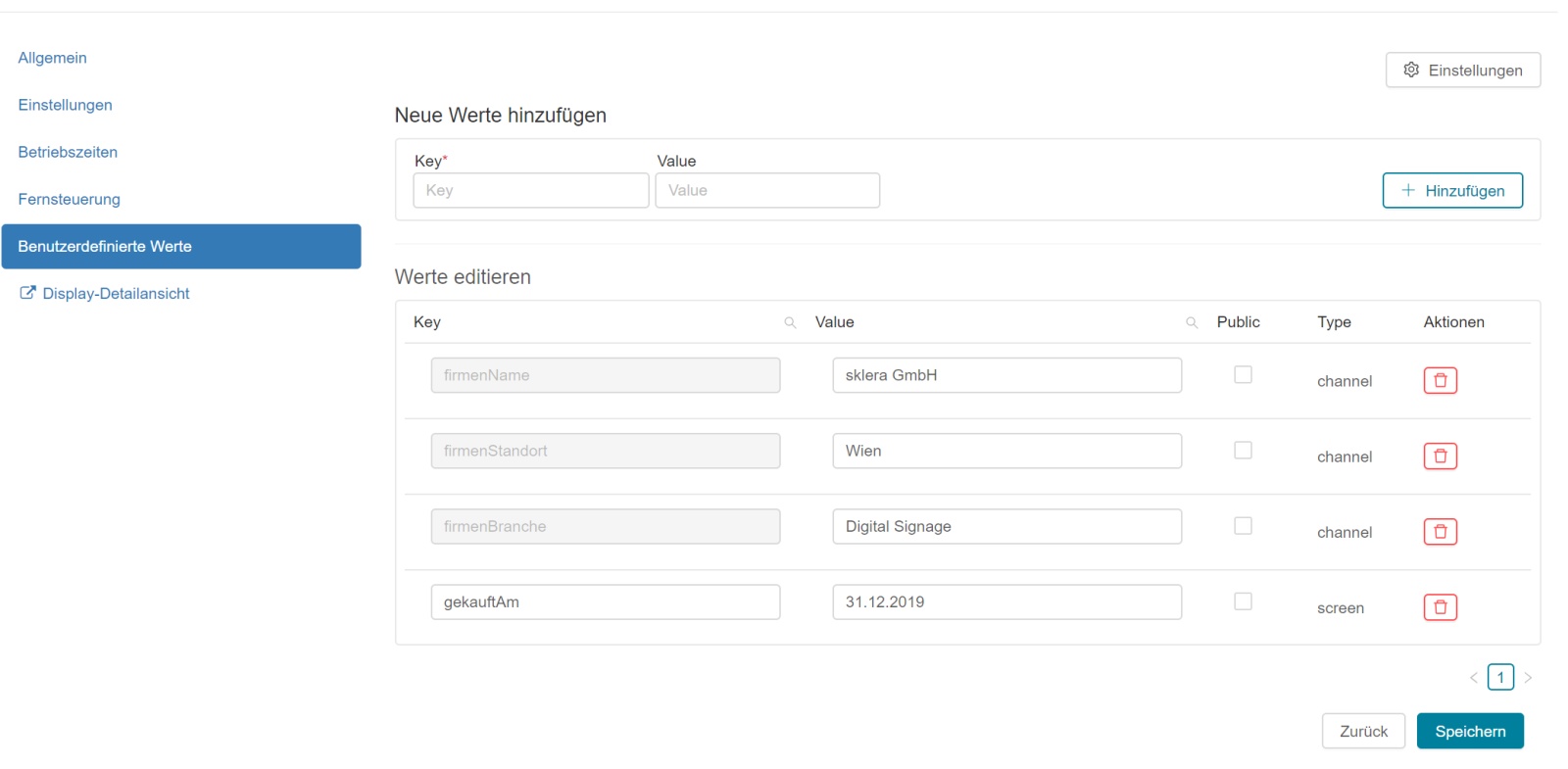 Mittels Benutzerdefinierten Werten können Sie ab sklera 3.7.1 sowohl in Channels als auch auf einzelnen Displays Platzhalter definieren, welche Sie daraufhin in Layouts einsetzen können.