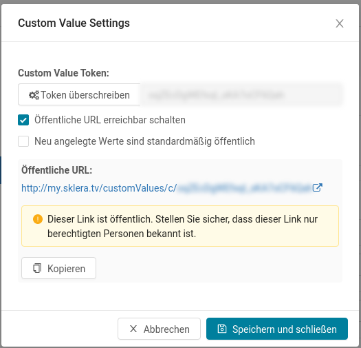 WARNUNG: Stellen Sie sicher, dass Ihr Token sicher aufbewahrt wird. Jeder, der die öffentliche URL kennt ist in der Lage, sämtliche hinterlegten Public Values zu bearbeiten und zu speichern.