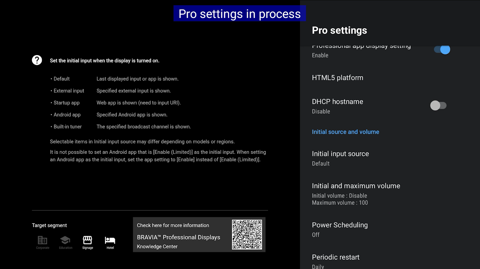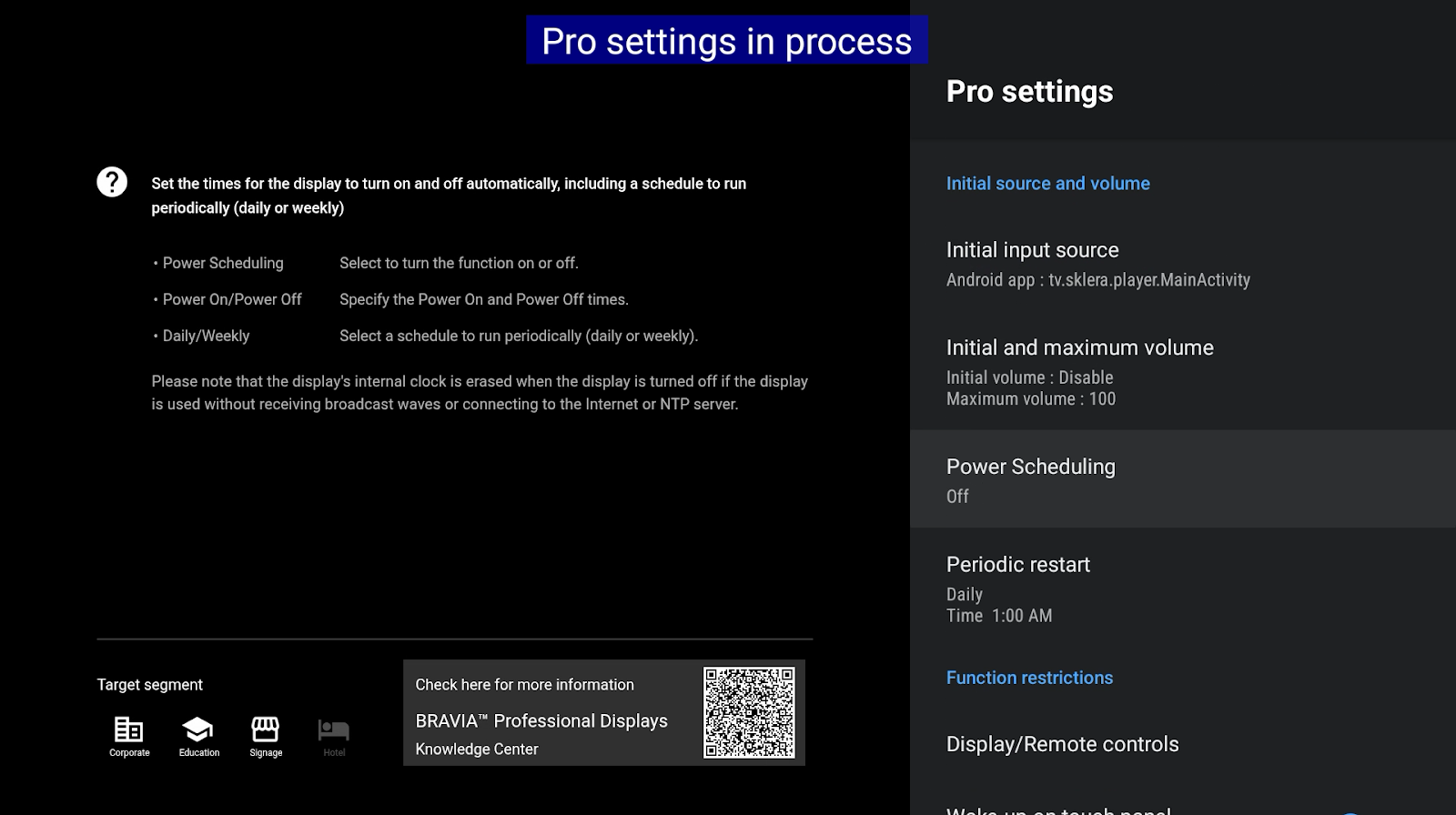 Im Pro settings mode werden Einstellungen für den Pro mode vorgenommen, in welchem die sklera Player App ausgeführt wird.