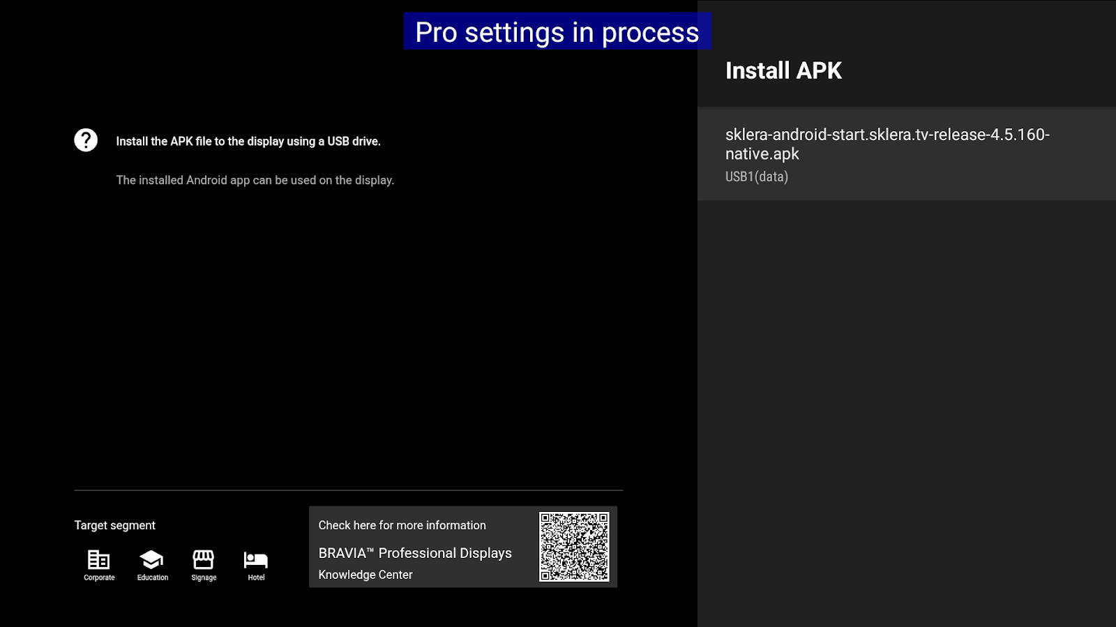https://sklera.tv/android/sony/sklera-android-finn.sklera.tv-release-4.5.179-native.apk - Kopieren Sie die zuvor heruntergeladene APK-Datei auf einen USB-Stick.