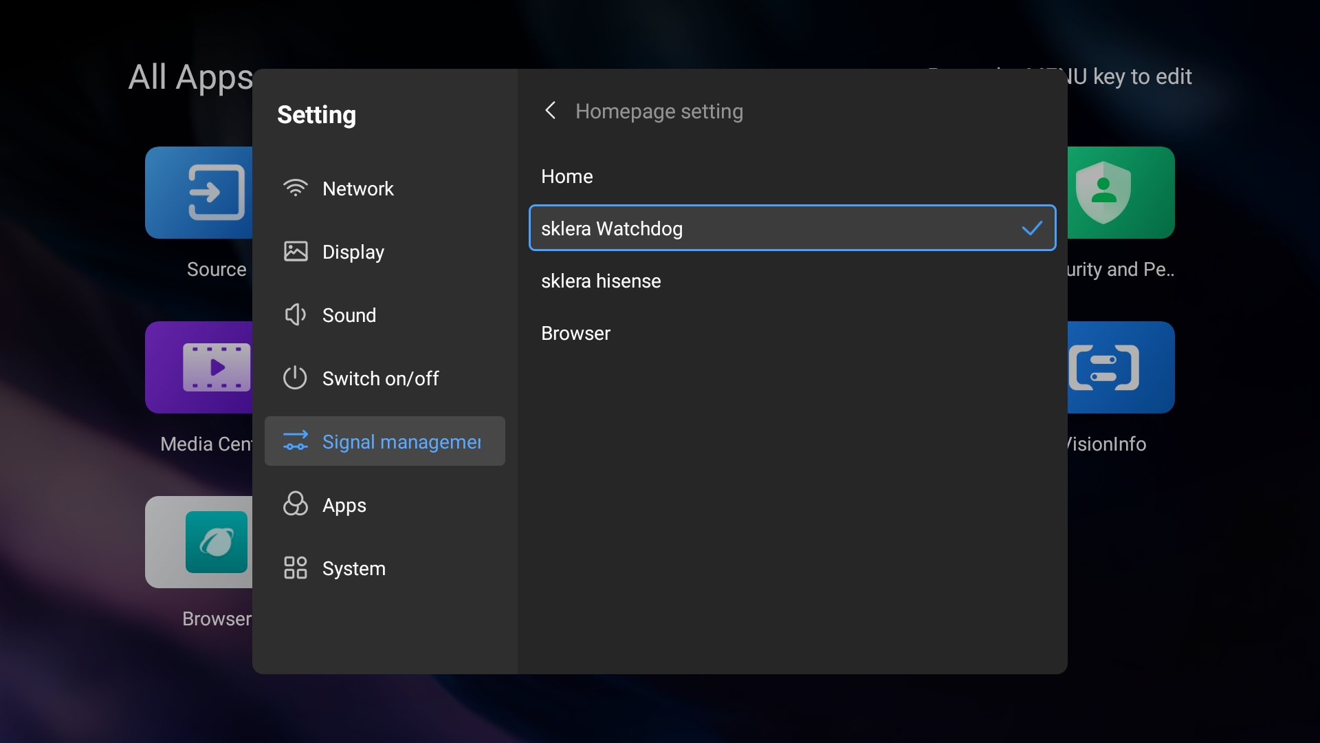 - Navigieren Sie zu "Setting" > "Signal management" > "Homepage setting" und wählen Sie "sklera Watchdog" aus. Dadurch wird der sklera Watchdog gestartet und für den Autostart beim Hochfahren des Hisense-Geräts eingerichtet.
