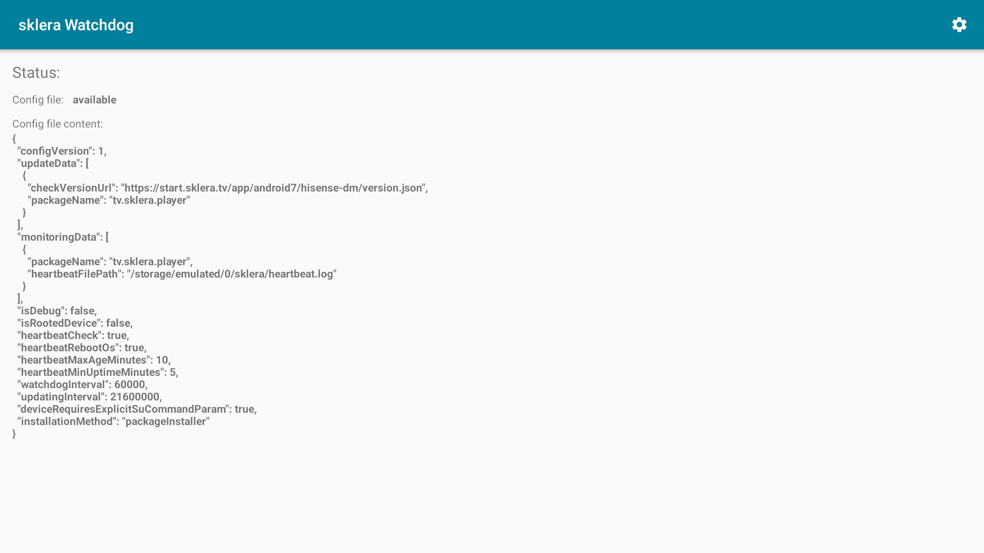 - Setzen Sie folgende Einstellungen.Debug ModedeaktiviertRooted DevicedeaktiviertExplicit Command ParameteraktiviertAuto update installation methodpackageInstallerPlayer nametv.sklera.playerHeartbeat checkaktiviertHeartbeat: Reboot OSaktiviertHeartbeat: Max Age10Heartbeat: Start delay5Auto updater config urlAuto updater time interval6 hWatchdog time interval1 min