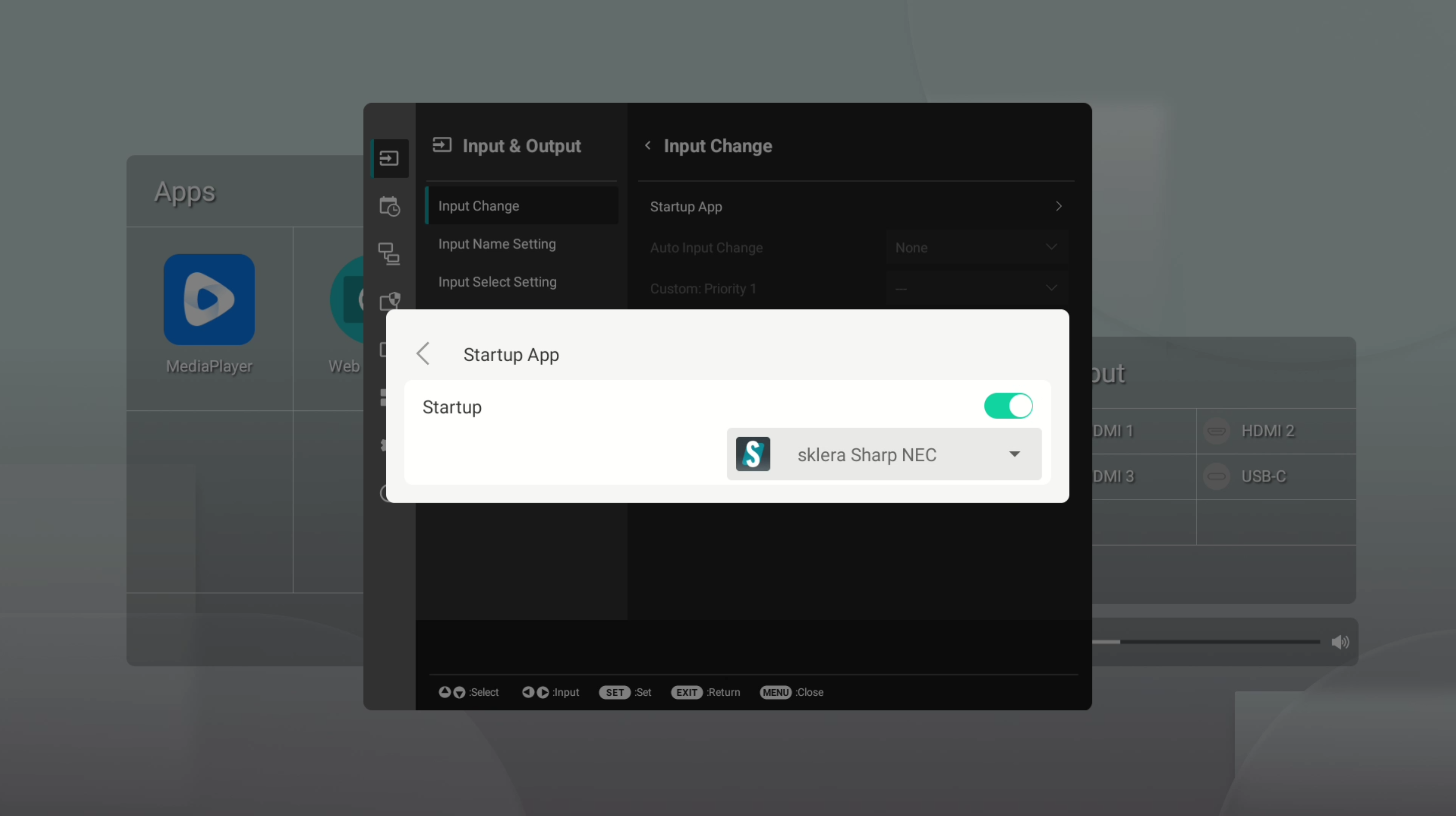 - Select 'Startup App'. In the pop-up window, enable the 'Startup' toggle and choose the app 'sklera Sharp NEC' from the dropdown menu: