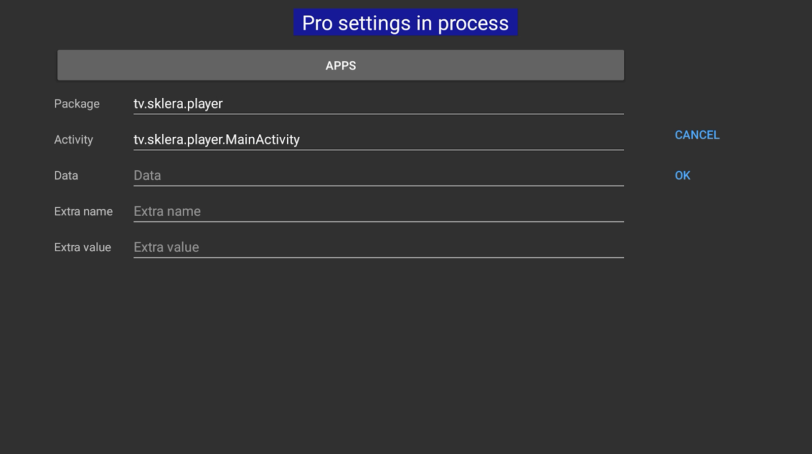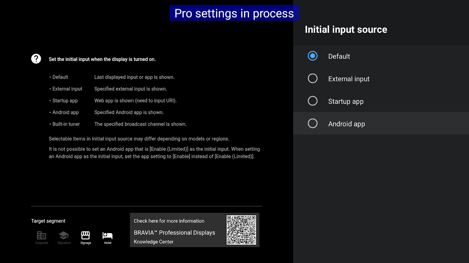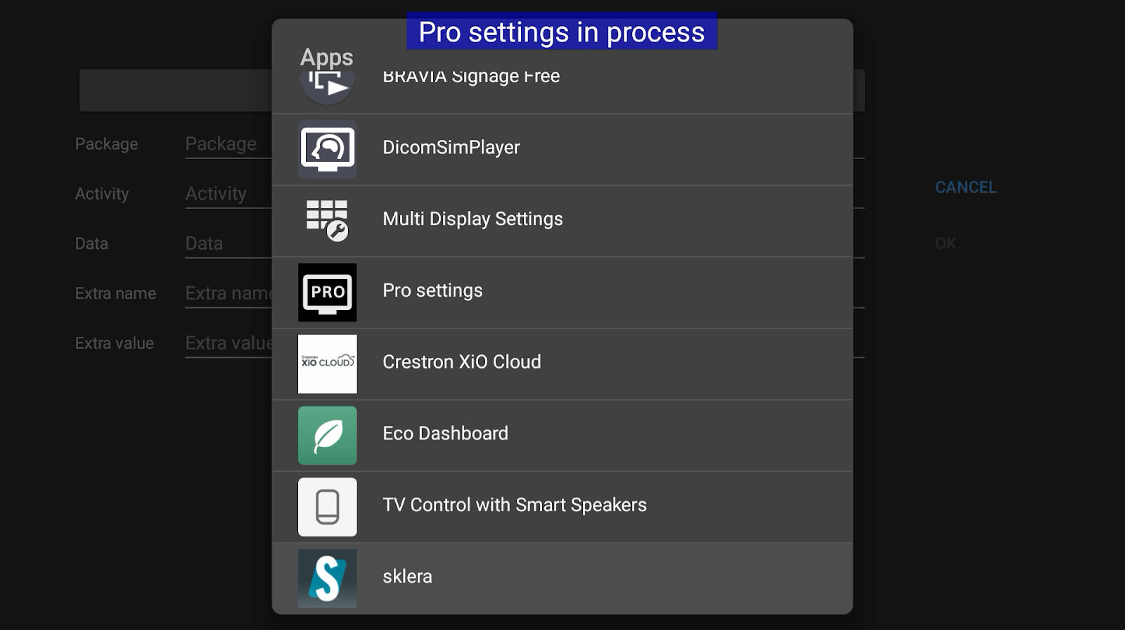 In Pro settings mode, you configure the settings for Pro mode, in which the sklera Player app will be running.
