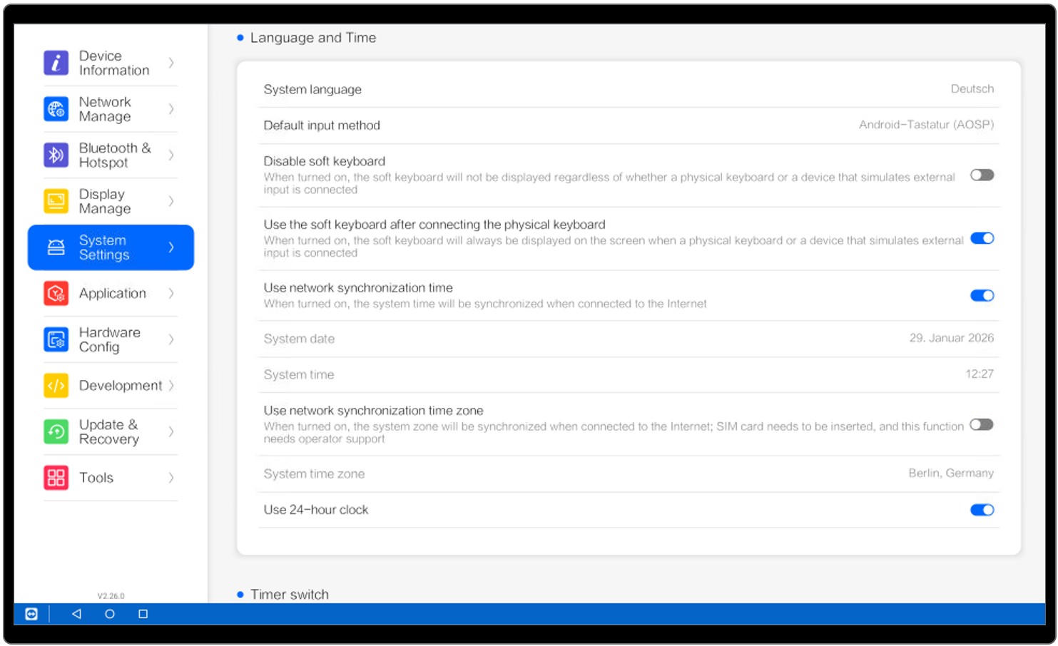 Go to "OS Tools" > "System Settings" and set the following values:Use network synchronization time enable Use network synchronization time zone disable System Time Zone select your time zone Use 24-hour clock enable
